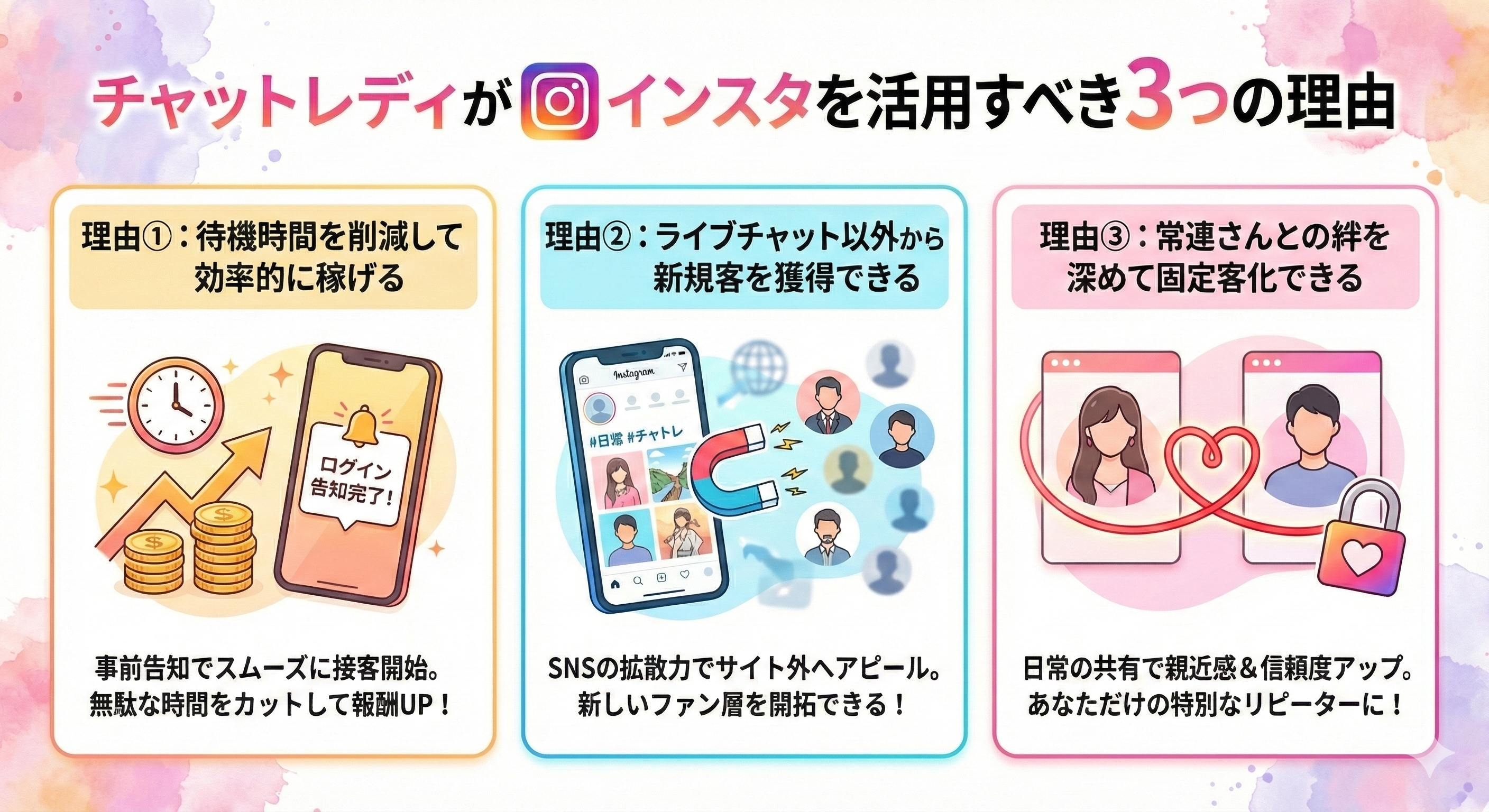 チャットレディのインスタ活用は、待機時間の削減や新規顧客の獲得、常連客の固定化など、収入アップにつながる強力な武器です。