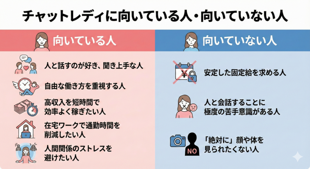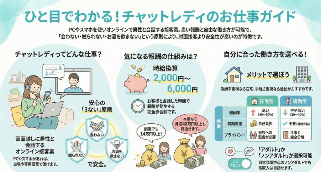 この記事では、チャットレディの仕事内容、報酬の仕組み、働き方の種類からメリット・デメリットまで解説します。
