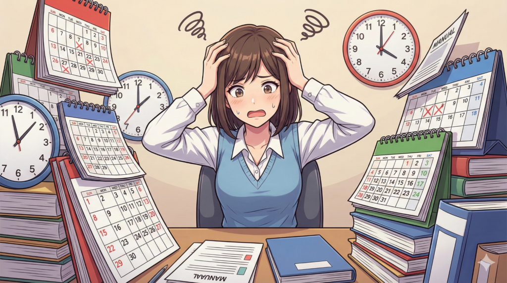 対策としては、スマホのカレンダーアプリで色分け管理するのがおすすめ。A事務所は青、B事務所は赤、といった具合に視覚的に区別すると混乱を防げます。