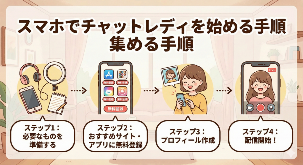 ここでは、実際にスマートフォンを使ってチャットレディのお仕事を始めるための流れを解説します。