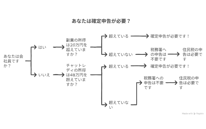 他に仕事をしておらず、チャットレディ一本で生活している「専業」の方の場合、年間の所得が48万円を超えたら確定申告が必要です。